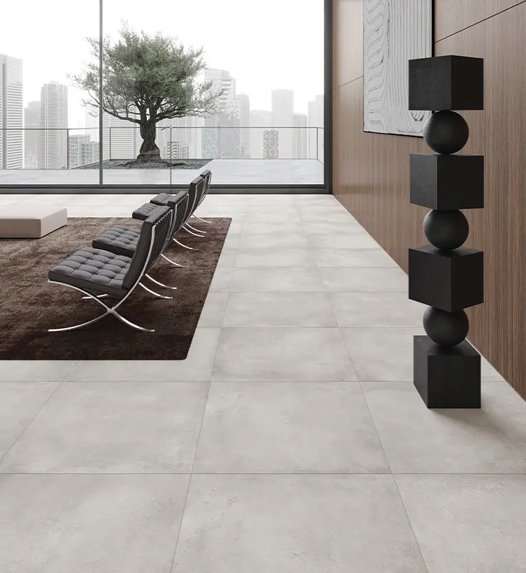Worn cement, oxidized metal, the fluorescence of an ancient stone all come together in this unique line. The rectified edges accentuate the modern appeal of this collection and its inherent technical resilience allows for usage across a wide spectrum of applications including outdoor settings.